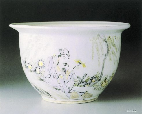 文物描述:外壁一面画一高士手持菊花,坐于柳荫菊丛下,画中人物应该就是晋隐士陶渊明,画意颇象征陶渊明饮酒诗句中「采菊东篱下,悠然见南山。」盆外壁白地上以各色彩釉描绘,黄菊、绿柳、蓝衣、赭石、其它则大多以黑彩钩绘线条。盆内白釉施半,以下至底部则涩胎无釉,应是为植花而设。胎骨略重,胎白细致。作工较粗,形制无一般嘉庆官窑以前宫中御用花盆、花钵之细致,因此将其定为清末景德镇民窑所制。陶渊明在隐居生涯中,钟爱的植物为柳、松、菊三种,其中又以菊花最为其偏爱。柳荫高士,既寓意归隐又喻高士,因此画中如要表现陶渊明的孤高不群、安贫乐道的隐逸生活,这三种代表陶渊明精神的植物,是不可或缺的。。此应两件一组成套的花盆,另一盆墨书「渊明酒兴子美情诗。辛酉秋月,景盛陶写。」