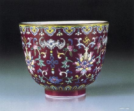 纹识描述:外壁紫红地饰粉彩,口沿下为如意纹一周,腹壁饰番莲四朵,其上各绘金彩万字符号,其间加饰蝙蝠口衔盘长结四组;蝙蝠与番莲之间又以桃实间隔,底边莲瓣纹一周,口足间则加饰金边二道。