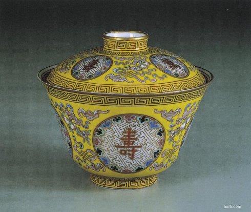 纹识描述:碗内白地上满画粉彩梅花、蝴蝶,器、盖内外口沿及底边、圈足均画回纹一道,碗、盖外壁黄地上四圆形开光万字内各书「万」「寿」「无」「疆」,并围以如意云纹;开光间以蝙蝠、桃实、盘长等纹饰,寓意万寿无疆。
