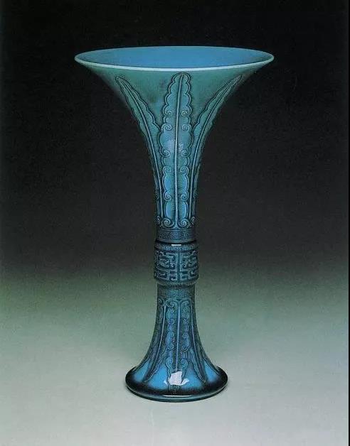 文物描述:仿铜觚造型,颈、足锥拱雕饰蕉叶纹,腹部饰蟠夔纹,隙地间饰回纹和云纹各两圈,通体满施孔雀蓝釉,足圈露白胎。晚明铜器的使用功能已经有所转变,一见铜觚经「打锡套管入内,收口作一小孔」,即可插花。或因铜器本身已逐渐被运用在生活中的各种场合,影响所及,烧瓷窑场亦起而模仿铜器的造型与纹饰来生产日常用品。此品产烧自清初官窑,仿自铜器的形制和纹饰颇发人思古之幽情,但器表施加的孔雀蓝釉,背后却有外来文化的渊源,此古与新的交融。