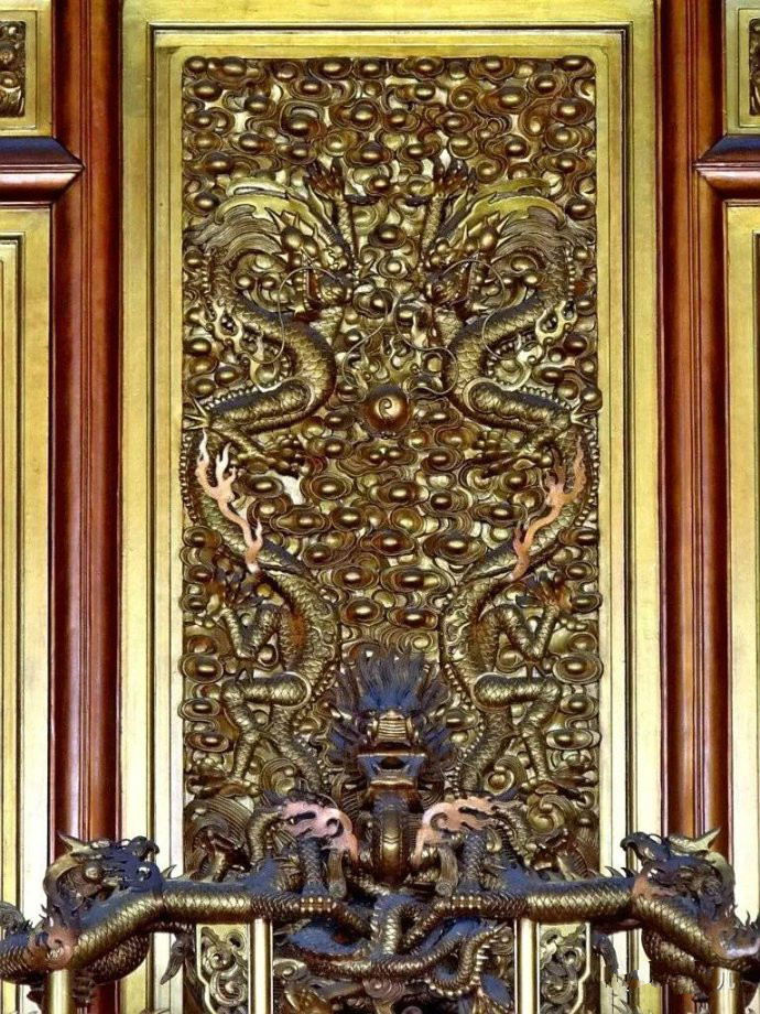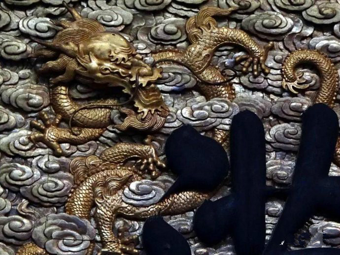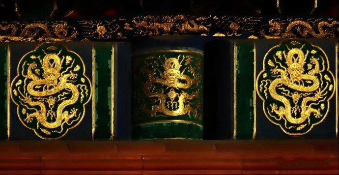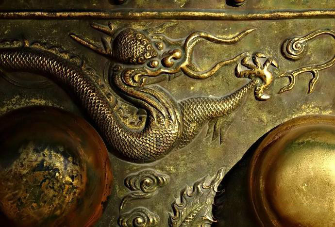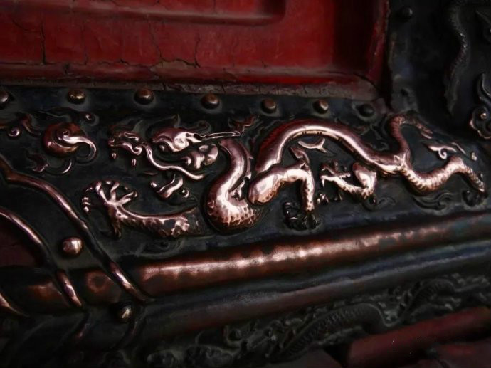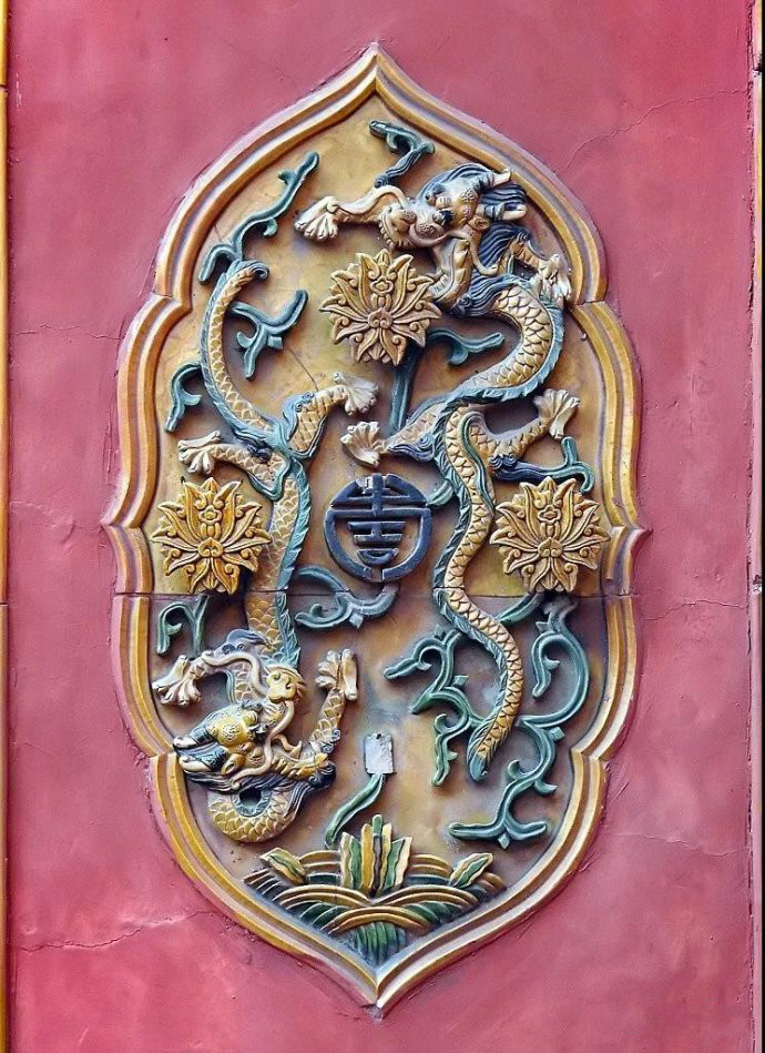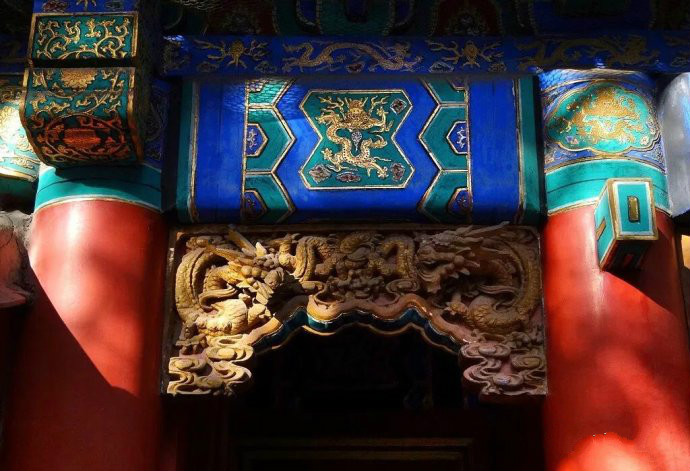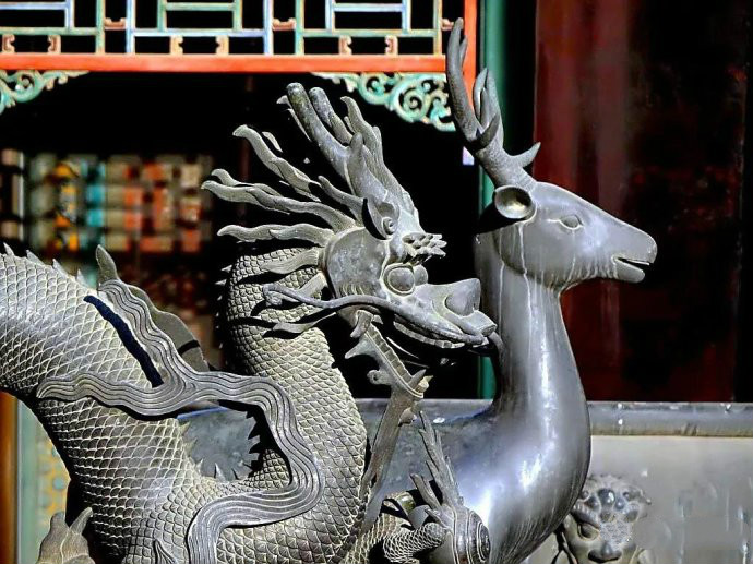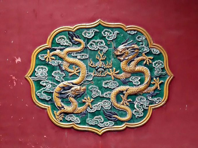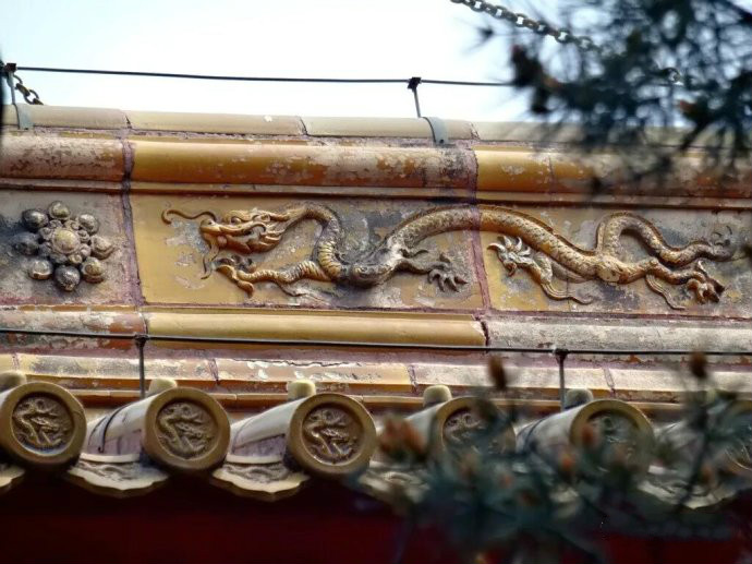 墙上镶嵌着琉璃龙 院子里摆着青铜龙