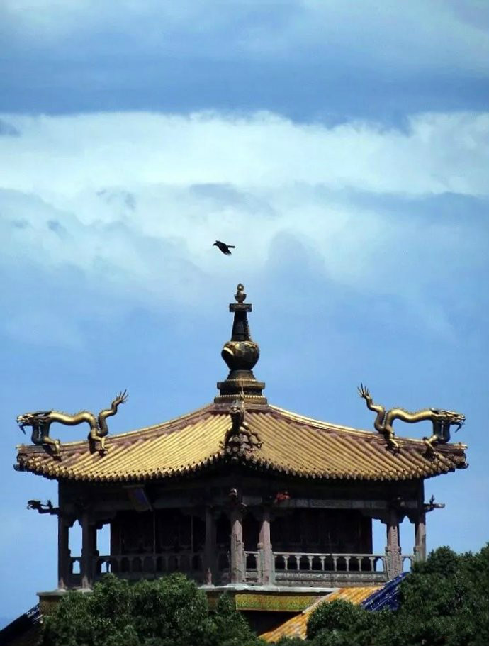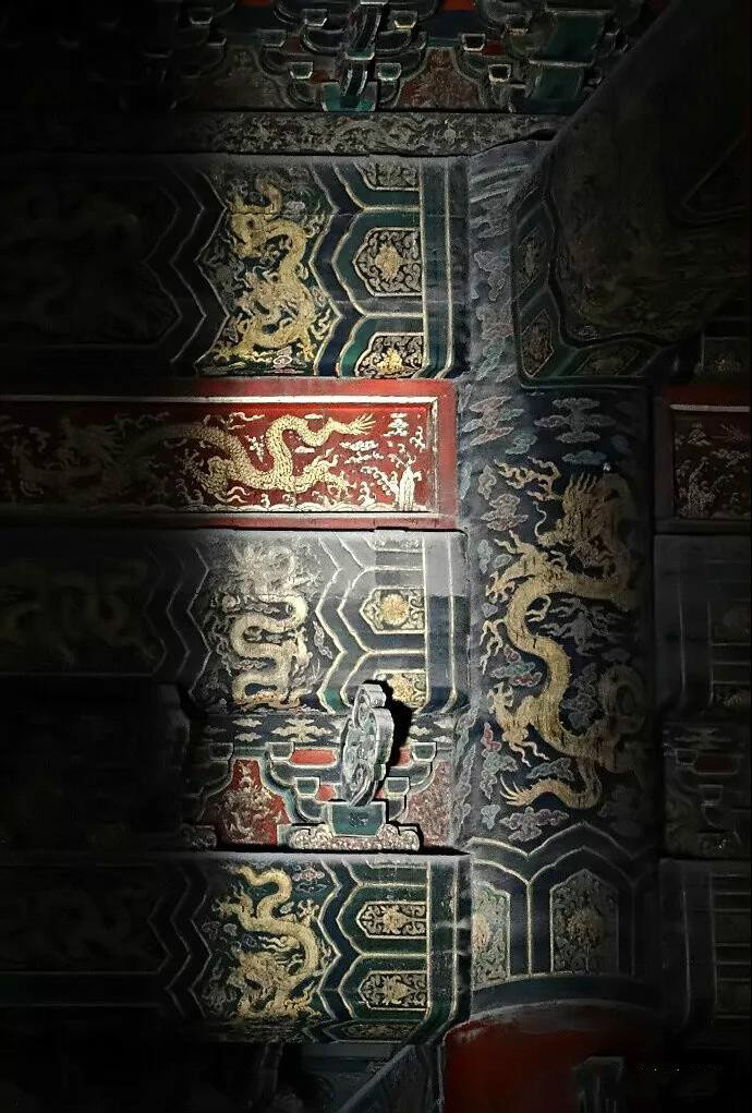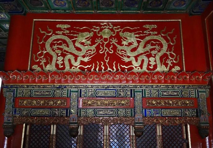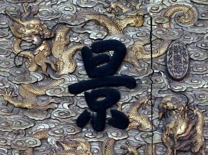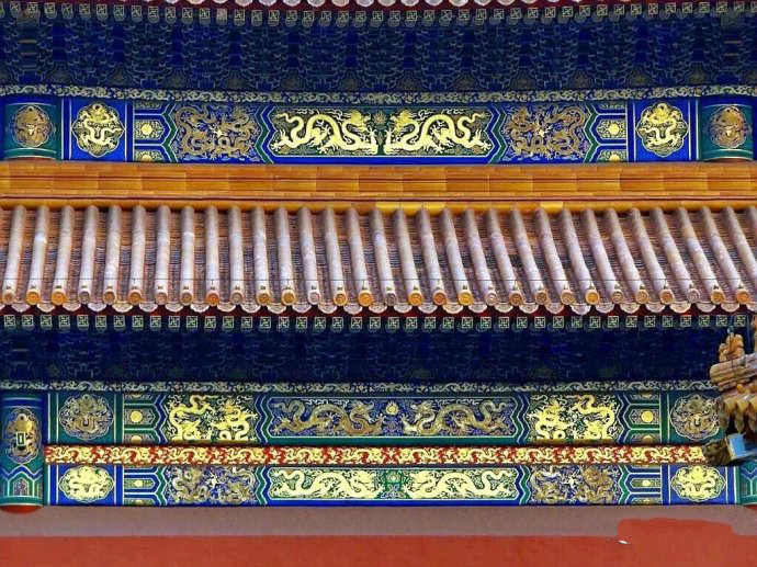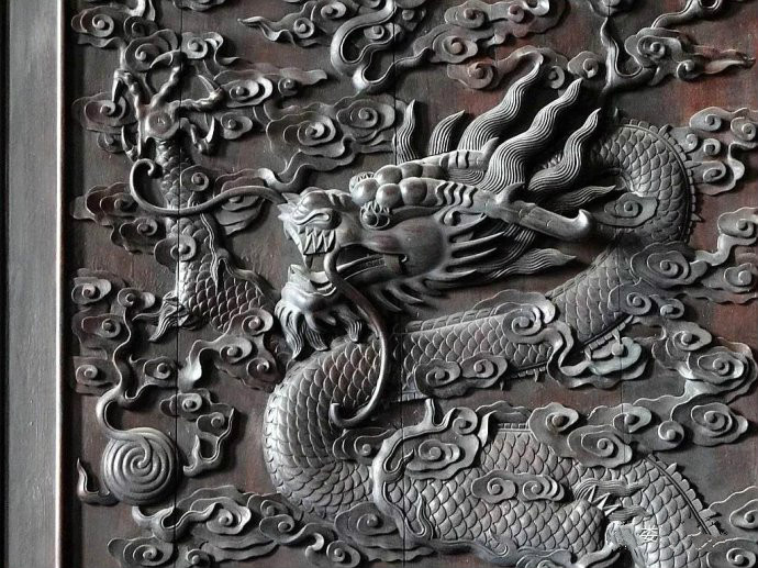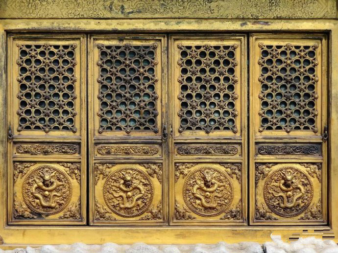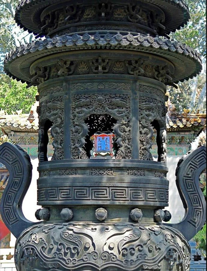墙上镶嵌着琉璃龙 院子里摆着青铜龙