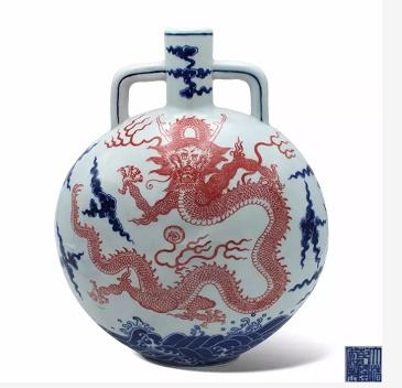 青花釉里红海水云龙纹抱月瓶,乾隆年的宫廷精品,直颈小口,颈饰双耳,扁圆腹,椭圆形圈足。其体态丰盈稳健,瓷坯洁白细腻,采用唐英首创的高岭土高配比的瓷土配方,加上工艺繁复的夯制,淘洗的过程,瓷胎更为紧密,从而使得瓷器物庞大而未有变形塌陷的优点,扁瓶通体施透明釉,纯净娇嫩,明亮透彻,瓶身以青花绘云纹,交叠悬停,气韵生动,在青花祥云纹的烘托下,一条以釉里红绘画的生龙腾然出现,龙首瞪目,冲发、长吻、利齿,龙身矫健盘旋,羽磷坚实繁密,指爪犀利,动感十足。瓶底再以青花绘海水纹,展示了苍龙出没于汹涌大海的场景,飞旋腾挪,气宇轩昂,一派皇家气息。青花与釉里红的相结合,不但工艺更为繁复,烧造也更为困难,但不一为报,只求装饰效果的精良,“不惜工本”可谓乾隆制瓷宗旨,在这件瓷器上充分展现在人们面前,无愧“历代美瓷推乾窑”的美誉。