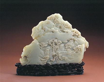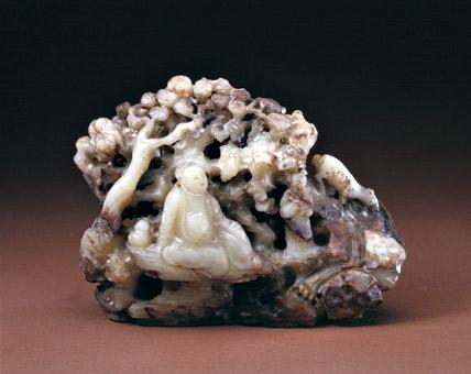 玉质青白色,含有较重的赭、褐色斑。随玉料外形雕山林景色,正面山林中,松树下,一老人坐于石上,衣带似解,左手扶膝,右侧置一葫芦,一侍童立于身旁,双手捧杯。一小溪顺势而下,上游一鹿俯首而立。山子背面雕大叶柞树。作品中山石用孔洞透空之法雕出,小溪则以集束折线表示,人物衣纹简单,为宋、元时期玉器风格。观松下之人,非农非儒,闲散洒脱,作品表现的是一种富裕的山林生活。