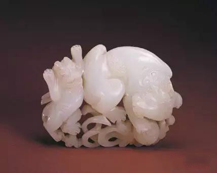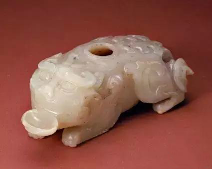 砚滴青玉质,利用玉斑圆雕作异兽形,兽背上驮有一水注,为贮水口,圆形水注上又雕饰小兽。