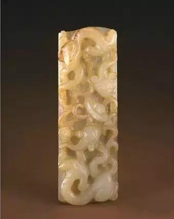 玉双螭纹臂搁,元,长10cm,宽3.4cm,厚1cm。