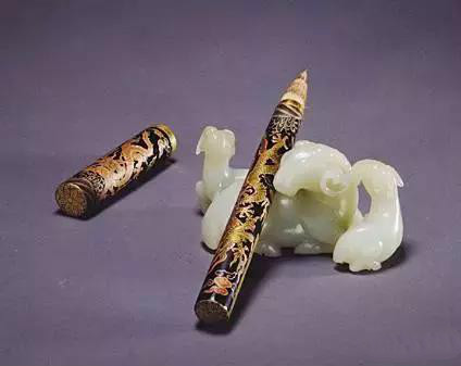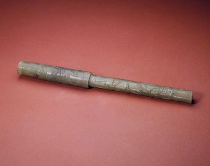 玉螭纹笔,明,通长23.7cm,管径1.6cm,帽径2cm。清宫旧藏。