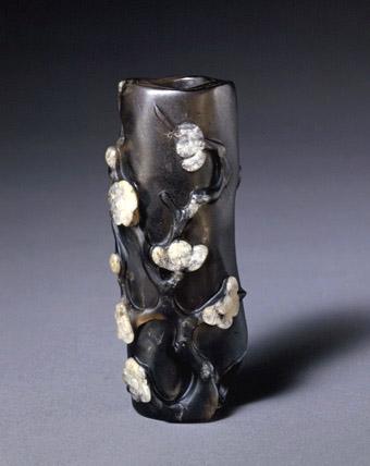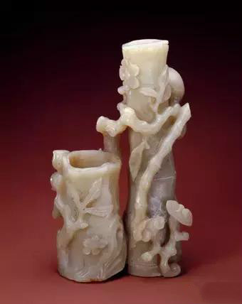 笔插是文房用品,管内可插笔或其它物品。明代,室内陈设及文房用品中多有此类作品。笔插取竹、桃、兰、芝之形,以象征君子之德。此作品造型高低错落,生动逼真,是明代玉器中的精品。