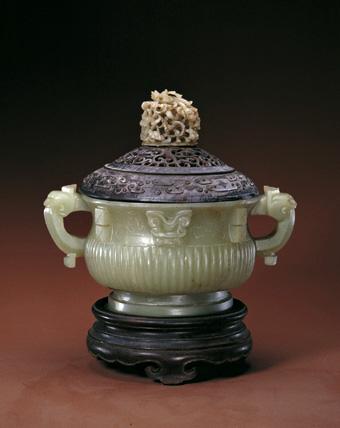 簋为商、周时流行的食器,这件作品为仿古器,造型较商、周古器有所变化。明代,这类仿古簋可用于室内陈设,也可用于燃香。此簋的木盖为清宫所配,紫檀木质,上雕仿古云纹及镂空卷草纹,盖钮为元代玉件。从木盖的形式上看,此物在清代宫廷中曾作为贮放香料的香薰。