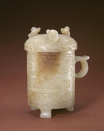 樽玉料青白,略显黄色。圆柱状,一侧为环形杯柄,柄上部有扳。樽深腹,平底,其下3足。樽身外壁饰夔龙纹及谷纹,下部近3足处分别饰兽面纹。盖隆顶,盖面上等距立雕3个兽形钮,似羊,盖面中部饰涡纹。