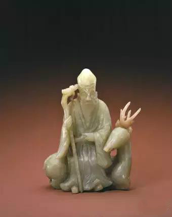 山子玉料青绿色,雕立体山林景致。作品下部为山石,其上高树成荫,并结有桃实,树下一老人当风而立,著长袍短褂,左手轻抚身旁小鹿,右手持如意,崖下又有一小鹿,口衔灵芝,仰首面向石上的老人。