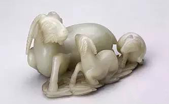 “三鹅”是印度婆罗门教中月天(月神)的坐骑。中国古人对洁身自好、风度翩翩的鹅亦颇喜爱,古代以鹅为题材的工艺品为数甚多。此青玉笔架碾琢精良,玉色洁润,鹅之形丰满柔美,且衔谷穗、花枝,当是寓岁美年丰之意。