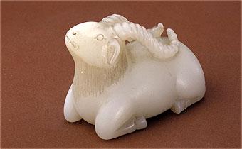 狮子生活于热带,在我国很少见,但很早即输入我国。中国历代工艺品中不乏狮子题材的作品,主要有两种:一种以真实的狮子为造型而加以变化,另一种较为夸张。目前见到的狮类作品多为传世品,制造年代的界定颇有难度,一般研究者以卢沟桥望柱饰狮及故宫断虹桥望柱饰狮的特征为参照来划定北方狮类作品的年代。此件玉狮为小头,腮部有弯月形弧线,具有明显的元代作品特点。