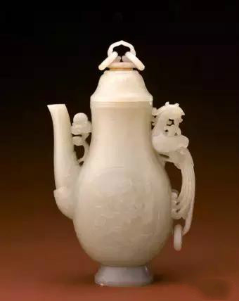 此执壶玉质纯正,表面光亮。壶体扁而高,椭圆形口,盖与壶口呈插接式,咬合紧密,盖钮为镂空如意形,套二活环,钮之下饰一周莲瓣。壶颈部饰变形莲花纹,腹部有椭圆形开光,开光内凸雕牡丹等图案。壶流为兽吞式,流柱自兽口中接出。壶柄为一全身栖凤,凤尾下部套一活环。