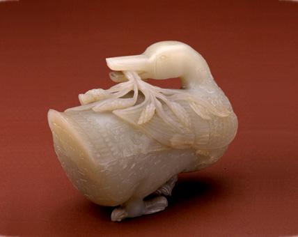 青玉回首鸭,清,长15cm,宽6cm,高10.5cm。