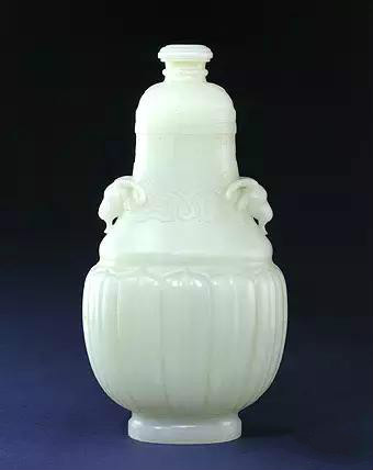 椭圆形,细颈,宽腹,双耳,椭圆足。盖顶下凸起绳纹一周。颈部浅雕夔带纹,腹琢莲瓣纹,肩两侧凸离羊首耳。玉质莹润。