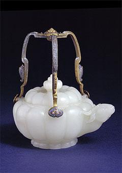 壶青玉质,圆口,圆盖,长颈,高挑流,曲柄,瓜棱形腹,莲座式足。壶肩琢一周缠枝花纹,壶嘴处嵌一金圈装饰。此壶玉质莹润,工艺精细,为痕都斯坦玉器风格。