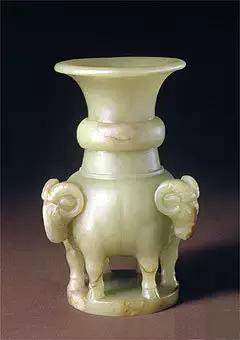 正因为“吉羊”为“吉祥”之意,所以从汉代以来,羊的雕塑品、装饰物都很多。此瓶以羊首饰耳,取吉祥、高望之意。原藏清宫翊坤宫。为乾隆时期的珍品。