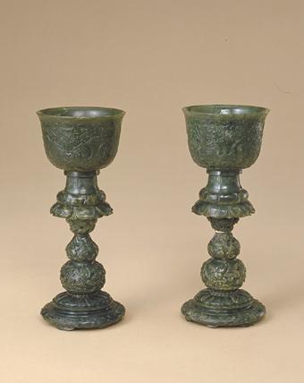 杯为一对,碧玉质地,由杯体与柄足两部分连接而成。杯体为钟铃倒置形,柄为葫芦形,杯体与葫芦形柄之间有一俯仰莲瓣形座,柄下为双层圆座。杯由上至下分别雕琢藤蔓、葫芦、缠枝莲、莲叶、雷纹等纹饰。