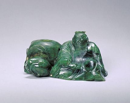 水丞碧玉质,局部有墨斑,圆雕人物和桃式容器,大小二桃相连,大桃内空,用以盛水,旁又雕一人斜倚水丞,以手扶膝,神情欢愉酣畅。
