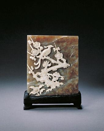 插屏玛瑙质,长方片状。正面运用俏色技法利用原料上的白色巧加碾琢,山岩、梅花、凤鸟错落其间,呼之欲出,衬以浅棕色的背景。背面阴刻隶书道光帝御制“探梅诗”: