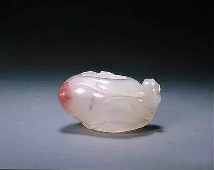 水丞白玛瑙质,半透明,局部有红色,作桃形,器内空,器外装饰镂雕的桃枝、桃叶,以巧做技法使料中的红色恰好置于桃尖上,生动逼真。