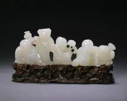 笔架青白玉质,以圆雕结合镂雕技法塑造姿态各异的5个童子,每人手中各持不同的花果枝叶。此笔架造型活泼,五子高低错落中洋溢着喜庆的气氛。
