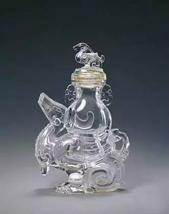 尊以无色透明水晶圆雕而成。天鸡翘首直立,双翅贴体,长尾卷曲支地,背负螭耳尊,尊的盖纽亦为一直立小天鸡。