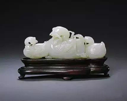 此作品造型生动准确,栩栩如生。六畜、家禽为玉雕动物中最常见的题材,自唐代之后,玉鸭之作多出新样。同历代作品相比,此件玉鸭更为精致,其背负的谷穗既有岁岁平安之意又有五谷丰登之祈,寓意不俗,是一件艺术水平很高的作品。