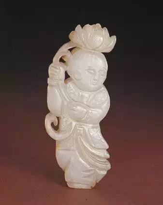 作品为宋代玉童子的典型形象,五官表现简单,以少量的短弧线表示衣纹。衣、裤、马甲等装束在同类作品中多有出现。唐代时,器物中已有荷莲童子图案,宋以后,这类玉雕童子日多,作品有“连生贵子”的含义,寓意吉祥。