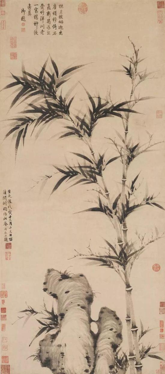 后世画家,凡写墨竹,无不受到文同与苏轼的影响,无不对其推崇备至。金代王庭筠,元代李衎、高克恭、赵孟頫、吴镇、顾安、柯九思、倪瓒、王蒙等,明初王绂、夏昶,他们写竹,备竹子之法度神采,又饱含君子之气度品格,直承文苏之正脉。之后,陈芹、姚绶、文征明、陈淳、徐渭、朱耷、石涛、金农、郑燮等秉承文苏之风骨,融自己之心意,不同与可,却能“高呼与可”,为文人墨竹注入了新鲜的血液。“墨君”也因此承载了更多的意象和更高的情志。传承是艺术得以延续的根本,但是它更感人的一面乃是其绝世而独立的精神,是其郁郁勃发、生生不息的生命状态。