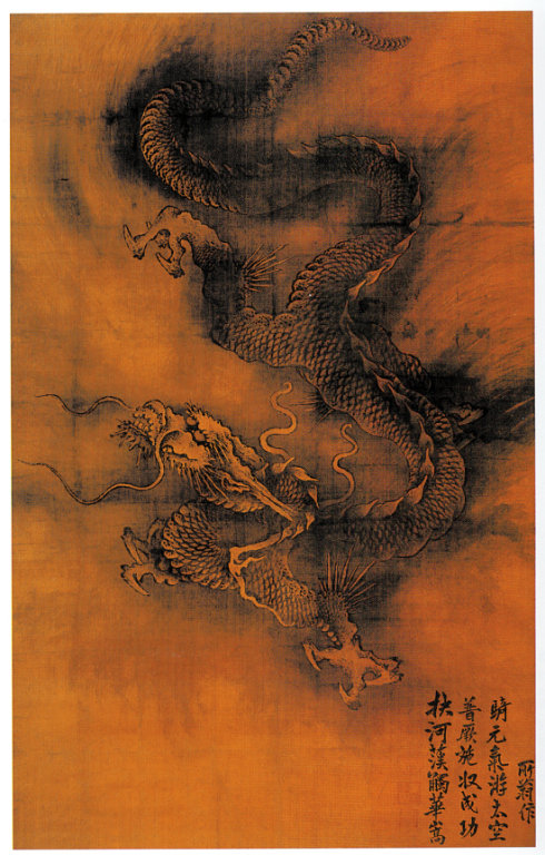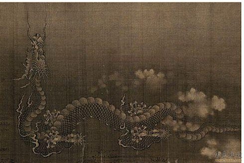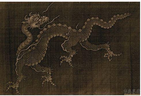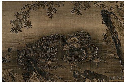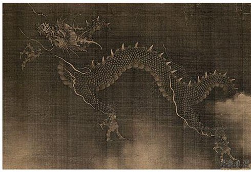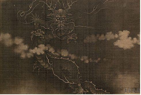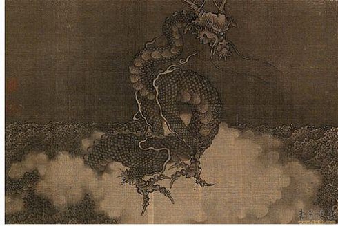 陈容,南宋画家。字公储,号所翁,福唐(今福建福清)人,一作临川(今属江西)人。理宗端平二年(1235)进士,曾为国子监主簿,出守莆田。诗文豪壮,善画龙,得变化之意。《墨龙图》可谓其传世之精品。此图为双幅绢本,纵201.5厘米,横130.5厘米,墨笔。不着色,而仅以水墨烘染云龙,墨气森严可畏,无疑是最佳表现形式。图绘一龙腾云驾雾,昂首瞋目,张牙舞爪,极其威武雄奇。勾笔劲健,而渲染的墨色,既有龙身的细笔积染,又有云气的粗笔涂抹,所谓“泼墨成云,噀水成雾”。传说他画龙必先喝酒至醉,然后大叫,脱下头巾蘸墨,在绢上信手涂抹,再用笔勾画之,或画整条龙,或仅画一爪一首,云雾蒸腾,时隐时现,似乎画家漫不经心,却都归于神妙之中。依我的看法,说他必喝酒大醉方画,似乎未必,试看其龙身勾、染之精细,非醉者所能,他之以头巾濡墨涂抹,虽然神奇,其实是画的需要。梁楷作《泼墨仙人图》,因画幅较小,且无动态,用笔“泼墨”即可。但陈容作《墨龙图》巨幅,云气有蒸腾之势,用南宋时现成的毛笔,实在无法表达,于是他延伸而用头巾“泼墨”,并非一时兴至。中国历代画家,多有以抹布、头发、纸筋、蔗滓、莲蓬、手指作画的故事,虽说确有游戏之意,但更多的是为了恰当地表达物象。陈容以头巾濡墨烘染出的云气,其势壮阔,如翻江而倒海,强烈地衬托出龙的“扶河汉,解华嵩;普厥施,收成功;骑元气,游太空”的非凡气概。它已经不再是传说中大禹治水时遇到的与人为害、象征自然之力的“龙”,不再是战国时期帛画中描绘的受人驾驭的“龙”,也不再是历史上某些苟安于一隅的小朝廷中的天子那样的“龙”,而成为一种堂堂正正、胸怀宽阔、威武自强、无坚不摧的精神的化身。
