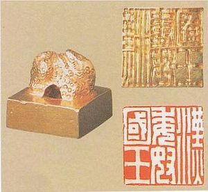 《后汉书·光武帝本纪》和《后汉书·东夷传》中记“建武中元二年(公元57年)倭奴国奉贡朝贺,使人自称大夫,光武赐以印缓。”这枚金印后来不知所踪,直到1784年,才在九州的福冈,由名叫秀治和喜平的二位佃农,在耕作挖沟时偶然发现。金印印面正方形,边长2.3厘米,印台高约0.9厘米,台上附蛇形钮,通体高约2.2厘米,上面刻有“汉委奴国王”字样,清晰的说明了倭国是汉朝的附属,是中日外交史上最珍贵的文物。