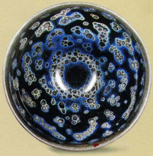 这是一个神异的文物,其实就单品而论,它完全可以排到第一的。这个茶碗是宋代黑釉的建盏(福建建阳窑),是宋人斗茶用的,但是这个样子的,莫说举世无双,就连考古发现的大量瓷片中,也没发现任何一个类似的。我曾经见过这个宝贝,当时它被单独陈列,底座不断旋转,在一片漆黑中,一个个光圈闪耀着妖异的光芒,而且随着光线角度的不同,光环的颜色会变幻不定,看着就让人敬畏莫名,完全不像是人间烧出来的瓷器。日本人形容这个碗,都是用“碗中宇宙”这种词,说里面仿佛是深夜海边看到的星空,高深莫测。这种曜变天目碗据说有两只,流传到日本之后,立马就都成了王公贵族争相追捧的宝物,其中一只被织田信长所得,毁于本能寺之变,剩下一只是德川家康传下来的秘宝,后来被三代将军家光赐给了春日局(有兴趣的可以去查查这些人的来头,都是日本史上最出名的人物了)。这个碗在明治年间被三菱总裁岩崎小弥太所得,但是他说,这是天下的名器,不是我配用的,所以一生都没用它喝过茶。