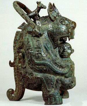 虎食人卣是中国商代晚期的青铜器珍品,也是日本藏中国青铜器中最重要的两件之一(另一件为永青文库的狩猎纹铜镜),通高35.7厘米,造型取踞虎与人相抱的姿态,立意奇特。它和许多出土于湖南的商代后期的青铜器一样,纹饰繁缛,以人兽为主题,表现怪异的思想。这件作品究竟是要表现老虎吃人的凶猛,还是人兽和谐的天人合一,历来说法不一,但可以确定的是,商代青铜器中很少有比这件更奇异复杂的了。