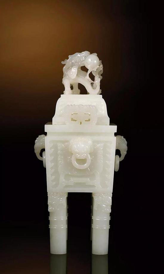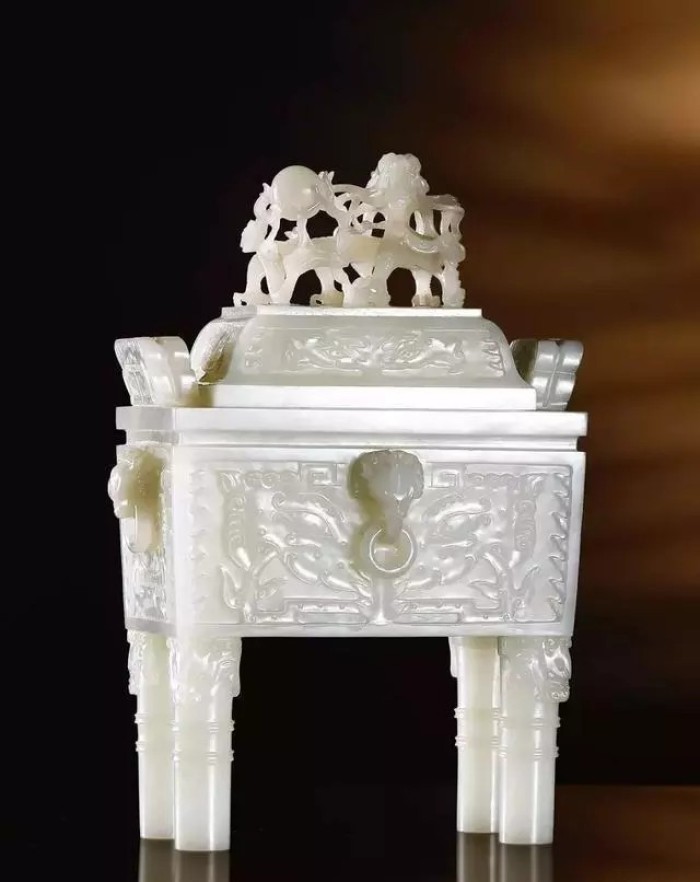 清乾隆·白玉饕餮纹龙钮盖方鼎。在清代仿古玉器中,最具鲜明特点的就是仿古彝器,即在器形、纹饰甚至是外部颜色上对商周特别是西周青铜礼器进行仿制。