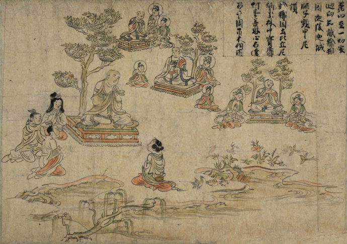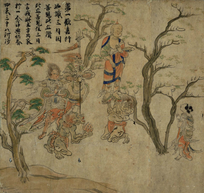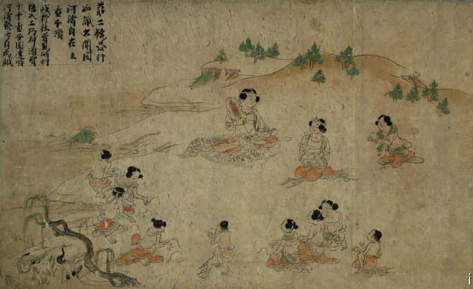 此作描述了《华严经》中记录的善财童子遍参善知识的经历。故事讲述的是善财童子心地纯洁,如天空般明净,听从文殊菩萨的规劝,遍参了55位善知识(才德兼备而能指引他人的高人),终于修成正果的美丽故事。这个表现主题在大陆(即中国)、日本自古就被造型化,此绘卷继承日本的传统,于镰仓时代中期临摹了制作于平安时代至镰仓时代初期的东大寺本(分藏于东大寺及他处。东大寺所藏为国宝,其他处所藏为重要文物)中的5段。原本凭借其柔和流畅的线条及宁静的色彩,展现了极高的思想性,本临摹本虽无法媲美原本,但也可以说具有原本的余韵。各段上书有的文字,为各位善知识的位阶及姓名,以及以各段内容为主题的诗文画赞。画赞采用的是与北宋时期著名文人苏东坡等相交甚密的杨杰的作品。