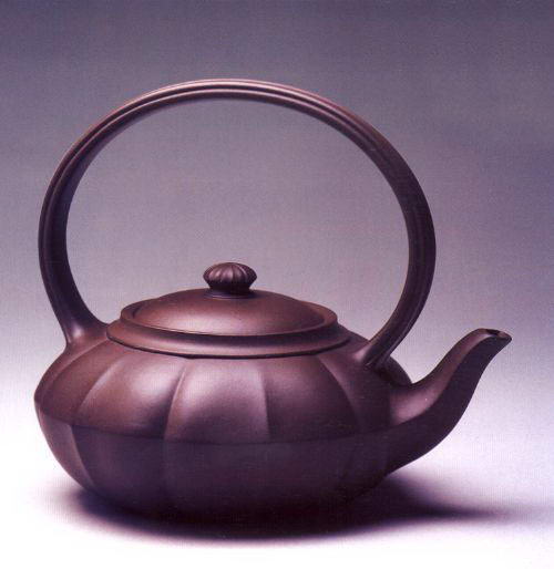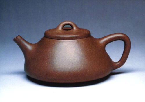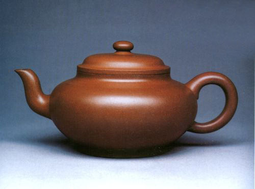 饱满挺秀的壶身对称圆弧型盖和盖上的圆桥型钮。而圆弧嘴向上伸,环型把重心向下及中央的盖的三者又有着横向呼应的协调。紫砂色润而华美,绞泥细纹如开片冰纹,有自然奇趣。