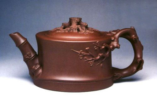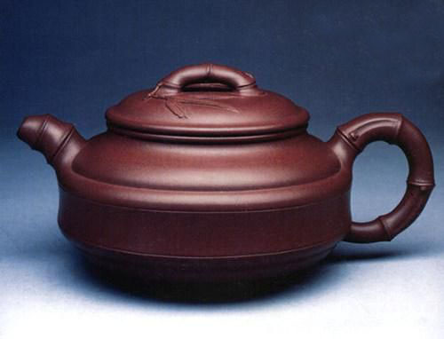 以竹为题材,夸张变化成形,壶身塑成主干,竹节简洁有致,中正沉稳。流、把化为新抽嫩枝,动势内酝,生动有力。盖上堆塑屈曲的竹枝为桥形钮,钮下贴塑竹叶纹饰。
