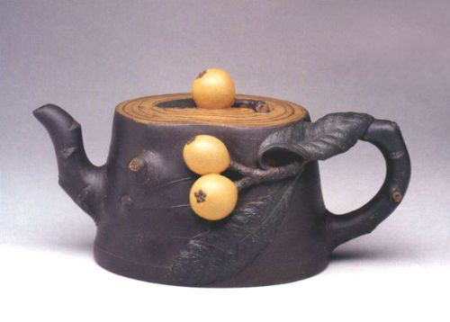 圆筒身小巧秀雅,细长流对细圆把挺括有神。夸张的大叶及圆饱结实的枇杷生动有趣。盖面饰以绞泥纹成年,一片绿叶衬着鲜黄的枇杷盖钮。此壶观来自然可喜。