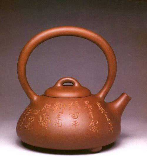 1992年四海壶具博物馆落成,海上画会诸名家齐聚共贺,汪寅仙制此壶为记。夸张的提梁擎起一道弧线,巧妙地为扇型圆弧壶身创造光圈效果。既像征群英聚集哲哲耀目,又似壶界与艺坛相互辉映。稍长的壶嘴衔接壶身形成拉高的线条,与弧形提梁呼应,构成一种向前的动势力感,颇有邀人畅饮的意味。壶身素面铭刻众画家名,由高式熊书,山头上人姚志源刻,笔下苍劲有力,掌握各画家签名的韵味。