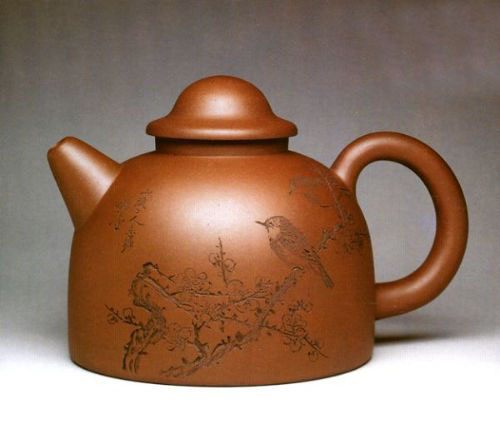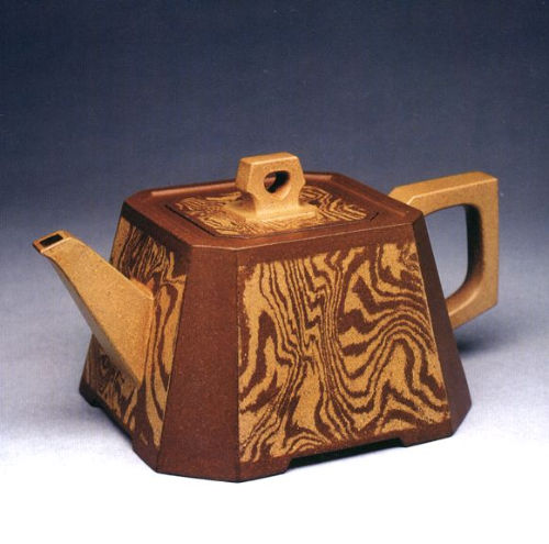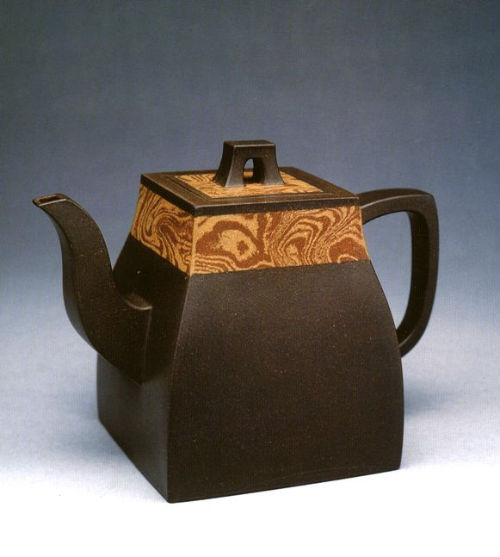 壶身做圆角方柱体。圆口,短坡颈,小圈足,桥形盖钮塑来大有古意。无论整体或局部造型皆可见方中寓圆之意,有如天地方圆,和协统一。