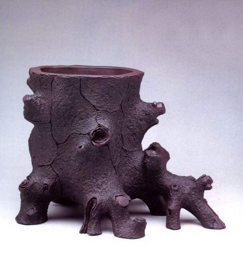 去皮露骨树桩为筒,根干为足,朴质有味。刻意将去皮处紫砂处理得润泽光滑,对比斑驳粗皮,形成装饰变化。老皮随干转折扭曲,增加视觉的动感,引人流涟。