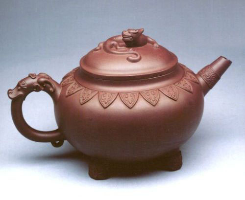 造型简炼有致,以细部雕琢刻划加以变化。扁鼓身,直颈,管状流微曲做蓄劲吞吐状,环形把,下有三只鼎状足。肩上堆塑云形图案,壶口与盖圈刻以仿古图形,盖钮成莲花微放状。