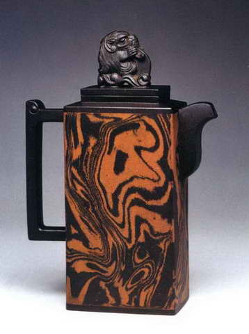 壶身作上小下大的八棱形,四个大面与盖面以红、褐两色相绞,纹样如云似水涌动变化,其余窄面及把、嘴采褐色,更衬托了绞纹装饰的华丽。