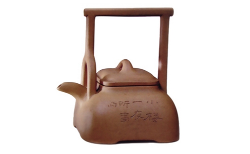 介绍的这款提梁壶,呈圆形,壶体上方的高架三叉相较在一起,曲、直相绕。圆盖凸起,砂泥质地细润。提梁造型与壶身一体,活泼气十足。到了清朝中期,提梁壶改为双提梁,使得壶的稳定性大大提高,同时壶形又更加美观。