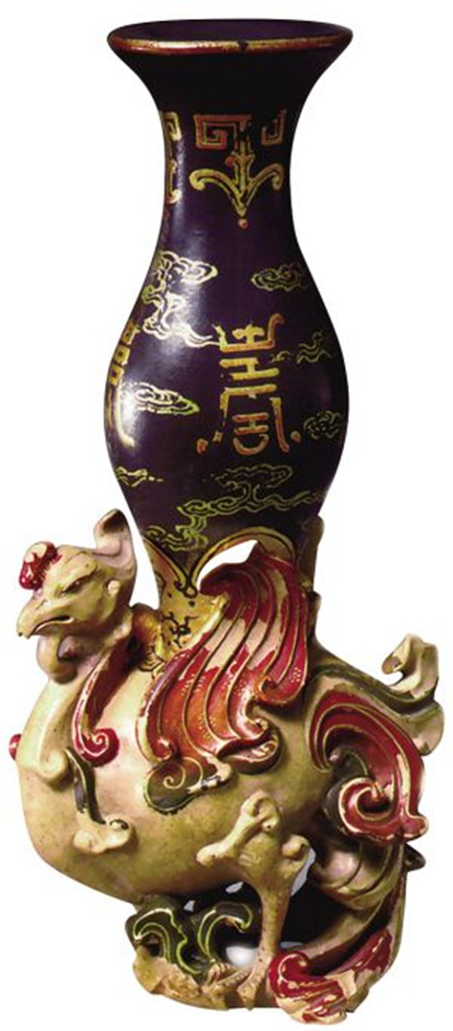 尊作天鸡驮宝瓶式,天鸡腹中空,与宝瓶的底部相通,鸡首口部有出气孔。通体以白、绿两色砂泥制成,以金彩描绘花纹。天鸡立于祥云之上,背托宝瓶,翅膀、鸡冠等部位施红彩。宝瓶上绘金彩祥云及“寿”字纹。此尊砂泥极细,装饰华丽,是乾隆朝宫廷御用文房清供之一。