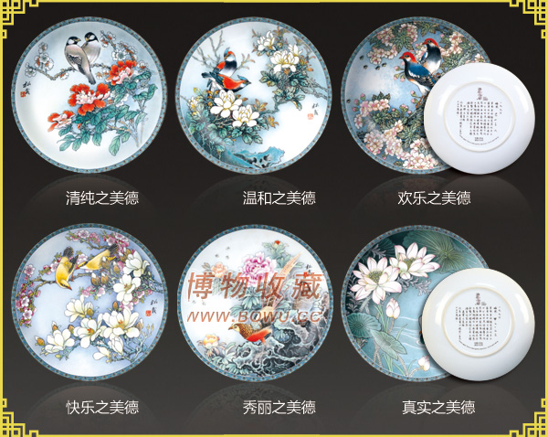 清纯之美德皇家景德镇瓷器厂继续沿用现任所创造的技巧与传统,吸收世代相传的知识与专长。[清纯之美德]乃为该传统技法下的一高超范例。工艺 美术家张松茂这一力作被艺匠再现于细瓷上,即真实的表达了作者的意愿,又传承了中国过去黄金时代艺术精美品质。磁盘第一集[清纯之美德],画者以中国传统 艺术风格体现大自然美好的事物。磁盘上花木扶疏,错落有致,一对梅花雀栖枝花叶,对视情深,笔法优美,栩栩传神,展现东方传统艺术绝妙境界,以丰富的象征 性语言表选出光辉灿烂的中华文化。