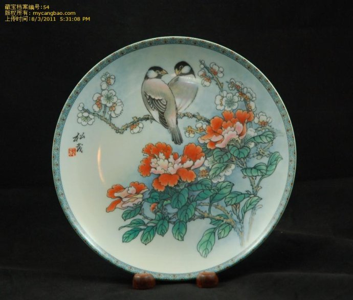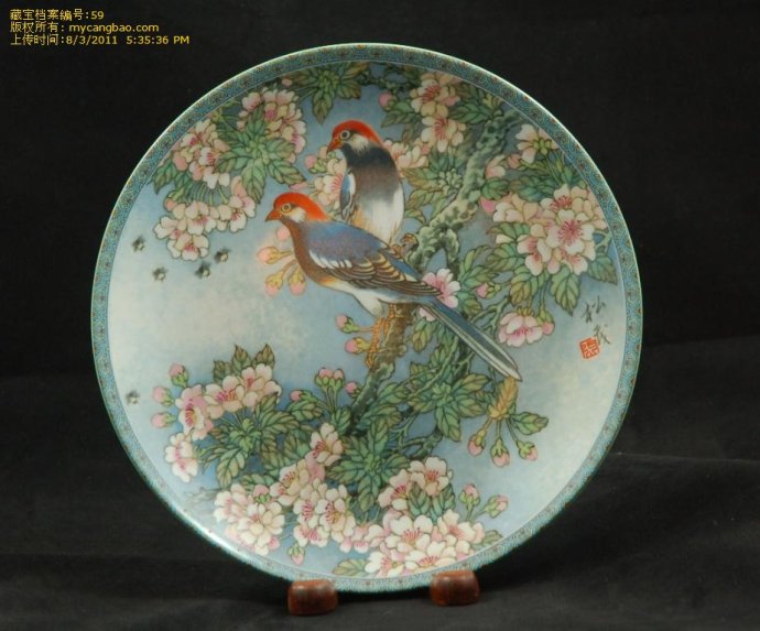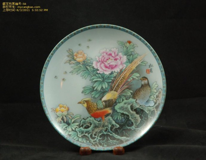 瓷 盘第三集[秀丽之美德]画者以中国传统艺术风格,表现出自然界美好的风光。瓷盘上百花吐艳,绿叶扶苏,野蜂迥翔,更有一对野鸡漫步其间,与背景相映成趣。 画面笔调优美,栩栩传神。画家以炉火纯青的东方艺术手法和象征向艺术[语言]表现了光辉灿烂的中国文化传统。中国民间传说和古代宗教信念向来蕴含一个基本 观念:天赋恩泽往往透过飞禽、走兽、树木、花卉传达给人类,而花鸟则往往是福寿、贞洁、与和谐荣绕的象征。俗话说,中国画是[无言诗]。工艺美术家张松茂 在彩盘[秀丽之美德]中,运用传统[神笔]手法,以牡丹和野鸡为媒介,传达了诗情并画意的艺术境界。 [快乐之美德]为此古老艺术形式一杰出范例。张松茂在描绘本彩盘时选择了牡丹和野鸡作为主题。牡丹花在中国被称为花王,其花硕大典雅,芬芳馥郁,重重叠叠 的花瓣中吐出一颗金嫩的花蕊,象征着女性的柔美。中国人以四种花代表四个不同的季节,牡丹是其中之一,被尊为春天的标志,可见花鸟的象征意义也是天赋的。 野鸡在中国画的象征手法中也具有重要的意义。野鸡羽毛色彩斑斓,尾翎修长夺目,是秀丽与富贵的象征。流苏凝作瑞华精,仙阁开时丽日晴。霜月冷销银烛焰,宝 瓯圆印彩云英。娇含嫩脸春妆薄,红蘸香绡艳色轻。早晚有人天上去,寄他将赠董双成。
