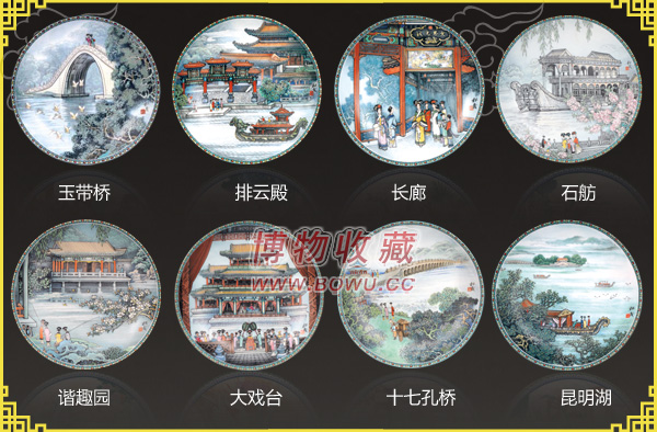 [谐趣园] 在颐和园的东北角,有一簇被围墙环抱着别具一格的建筑,这就是谐趣园,又称[园中之园]。工艺美术家张松茂所绘制[中国颐和园之景]系列第五集就取景于谐 趣园。乾隆皇帝曾多次移驾考察祖国疆土,有一次往返于慧山脚下的华南名胜——无锡寄畅园,于是根据该园的详细图纸,命人在万寿山下仿造了一座庭园,取名 [惠山园]。后遭敌寇毁坏,一八一一年重建时得现名谐趣园,含义静心冶趣,天人合一的东方观念。张松茂大师在[谐趣园]重精心表达的正是这种人合天一的谐 趣境界。画中一汪清澈的湖水把园中的美景尽揽镜中:曲线流畅的水榭瓦顶,宛若趟水巨足的平台支柱。依依的垂柳佩一只摇曳的木蘭,几只金翅雀掠过晨风。与大 千世界相比,这里的一切都显得细小,静谧、细致、别具风姿,天工匠意浑然化为一体。张松茂大师用色考究:整个画面以翡翠、蓝绿等冷色为主调,背景中的色彩 伴以柔和的白色,渐渐淡入迷漫的晨雾之中。即使是瓷盘系列的常见主题——那些珠光宝气的仕女们在这里也显出依然自得的申请。她们手捻钓杆,再现了当年帝王 后妃在此取乐的情景。 [谐趣园] 的高超艺术手法体现了中国山水画的传统。该画画面线条优美,色彩丰富,具有几世纪以来艺术大师的手笔。张氏的杰作是我们得以一窥这人间天堂的妩媚与精谧, 并把我们带回到只有帝王后妃,宫女彩娥在园中漫步的年代。谐趣园在万寿山东麓,是一个独立成区、具有南方园林风格的园中之园。清漪园时名叫惠山园”。 1811年重修后,取“以物外之静趣,谐寸田之中和”和乾隆皇帝的诗句“一亭一径,足谐奇趣”的意思,改名为“谐趣园”。